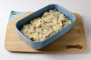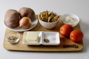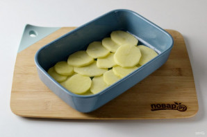 Бульбу ачысціце, нарэжце кружочкамі. Выкладзіце на дно формы для выпечкі палову.