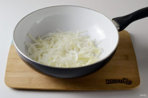 Парэжце цыбулю тонкімі паўкалячкамі. Тушуйце яе на слабым агні ў масле з шчапоткай солі і цукру да мяккасці.