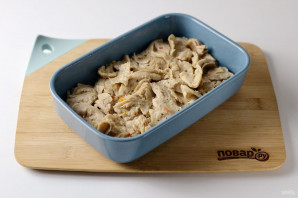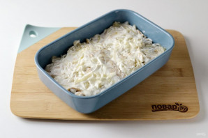 Прамажце гэты пласт майонэзам. Наступным пластом выкладзіце другую палову бульбы.