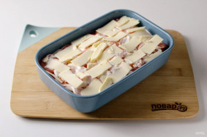 Зверху прамажце батаннік маёнезам і выкладзіце тонкія пласціны веганскага сыру. Запякайце страву 45 хвілін пры тэмпературы 180 градусаў.