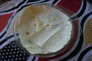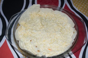 Форму для запекания необходимо смазать маслом. Тонкий лаваш нарвите на небольшие кусочки. В один слой уложите лаваш в форму так, чтобы полностью закрыть дно формы. Вместо формы я использую крышку от стеклянной кастрюли.