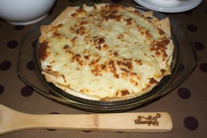 Последним слоем может быть как брынза, так и лаваш. Это уже на ваш выбор. Если последним слоем будет лаваш, смажьте его молоком, чтобы при запекании он не превратился в чипсы.