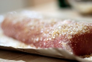 1. Куриное филе под прессом превращаем в "колбаску". Натираем солью и сахаром со всех сторон, оставляем в холодильнике на три дня.