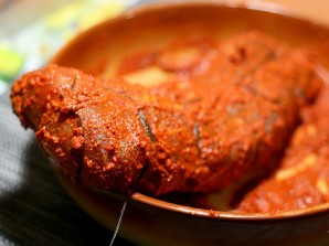 2. Далее смешаем в миске много-много специй по вкусу и разбавим водой или растительным маслом. Щедро "вымазываем" мясо в этой смеси.