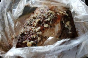 4. В режиме "Тушение" держим час-два (в зависимости от размера куска). Если к мультиварке у вас ничего не пригорает, можно обойтись и без пакета. Вот так выглядит полностью остывшая куриная бастурма!