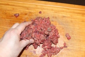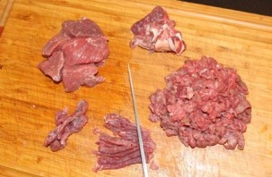 Сёння мы будзем гатаваць вялікі, смачны і сачны біфштэкс! Для гэтага спатрэбіцца ялавічная выцяг. Я ўзяла звычайнае ахалоджанае ялавічына мяккае. З яго тэж атрымліваецца вельмі смачна, але, вядома, не так мякка, як калі гатаваць з выцягу. У абодвух выпадках мяса трэба прамыць і высушыць. Абрэжце ўсе плёнкі і сухажыллі, нарэжце спачатку тонкімі палоскамі. Потым палоскі нарэжце невялікімі кубікамі, як паказана на фота.