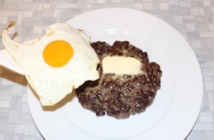Цяпер прыйшоў час сфармаваць выніковы страву. На плоскае вялікае блюдзе выкладваем гарачы (толькі што з духоўкі) біфштэкс, кладзем на яго невялікі шматочак сметанковага масла, і...
