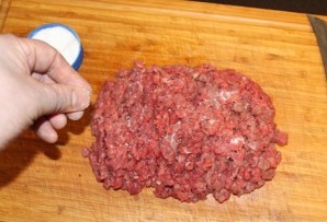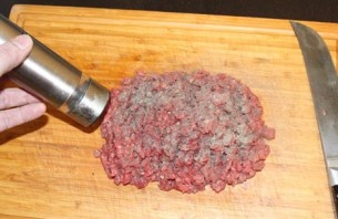 Вельмі старанна размінаць (не менш за 5-7 хвілін) рукамі, нібы вы размінаеце цеста, каб мясныя валокны пачалі ледзь зліпацца паміж сабой. Гэта вельмі важны этап! Калі вы цяпер недастаткова добра размінаеце мяса, пасля ваш біфштэкс можа разваліцца!