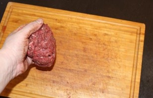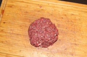 Потым добра дробленае ялавечыну трэба сабраць у шар і адбіць аб сталовую дошку 1-2 хвіліны. Каб на кухні было чыста, можна мяса пакласці ў любы цэлафанавы пакет і адбіваць вашае будучае біфштэкс праз пакет...