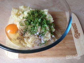5. Дадаем у пюре яйка, дробна нарэзаныя зялёны лук і кроп, соль і перац па смаку. Змяшаем да аднольнасці.