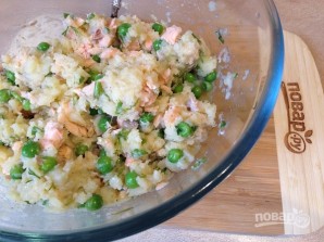 7. І акуратна змяшаем, каб у бульбачнай масе засталіся цэлымі гарошак і кавалачкі рыбкі.