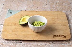 Авокадо очистите, удалите косточку и раздавите вилкой. Посолите и поперчите, добавьте лимонный сок.