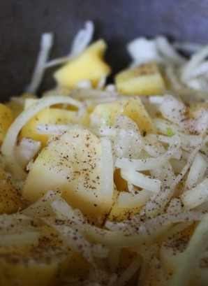 1. Бульбу нарэжце ломцікамі, цыбулю — паўкалячкамі. Выкладзіце на дно казана, дадайце спецыі паводле смаку, добра перамешайце рукамі.