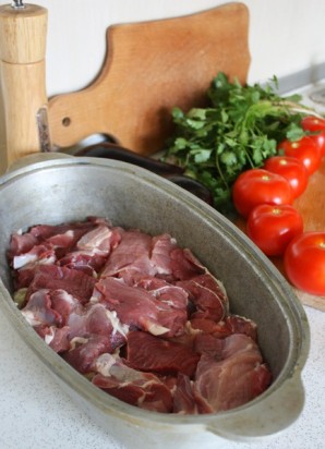 2. Цяпер нарэжам мяса сярэднімі кавалкамі, выкладваем на гарбузу. Пасолім і паперчым па жаданні.