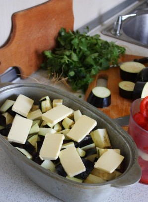 3. Баклажаны нарэжце кружочкамі ці ломцікамі, выкладзіце на мяса. Далей — масла нарэжце кавалачкамі і выкладзіце на баклажаны. Закрыйце казан крышкай і пастаўце ў разагрэтую духоўку на гадзіну.