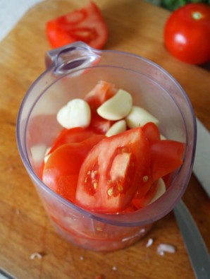 4. Пакуль зробім таматны соус. Для гэтага памідоры разам з ачышчаным часныком збіваем у блендэры да стану пюрэ. Пры жаданні дадамо спецыі, соль і перац. Праз гадзіну страву дастаем з духоўкі, паліваем соусам і пасылаем тушыцца яшчэ на гадзіну.