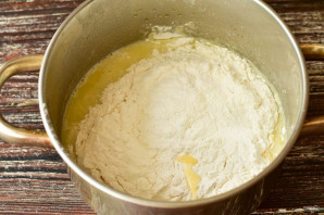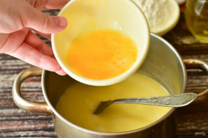 Добавьте щепотку соли, влейте яйцо, которое взболтайте в отдельной миске вилкой.