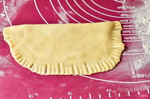Скрепите края вилкой. Жарьте чебуреки на сковороде, разогрев в ней предварительно растительное масло.