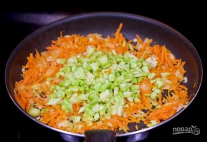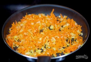 2. Маркову натрыце на дробнай цёрцы і дадайце ў скавародку на 2 хвіліны, перамешвайце цыбулю з марковай лыжкаю.