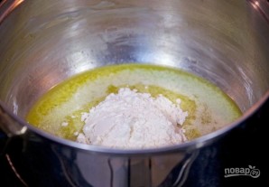 4. У асобнай посудзе растапіце астатняе масла на сярэднім агні. Дадайце мукі і змяшайце ляпаткай.