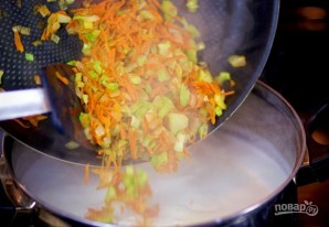 7. Запячэнныя агародніны дадайце да бульёну. Пасаліце і паперчыце па смаку.