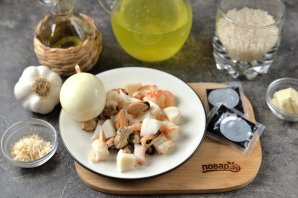 Подготовьте все необходимые ингредиенты. Морепродукты разморозьте, промокните их бумажными полотенцами. Почистите и помойте лук с чесноком.