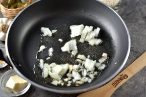 Разогрейте в сковороде оливковое масло, слегка поджарьте на нем измельченный лук и чеснок до прозрачного состояния.