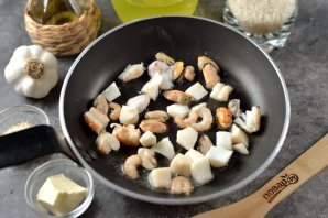 Быстро обжарьте морепродукты на другой сковороде в минимальном количестве масла около минуты на сильном огне.