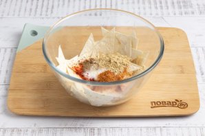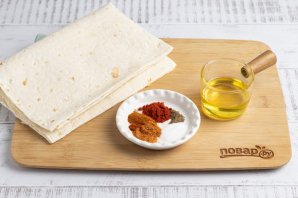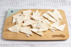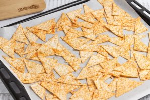 Выложите порезанный лаваш на противень застеленный пергаментом для выпечки. Выпекайте чипсы около 8-10 минут в разогретой до 180 градусов духовке.