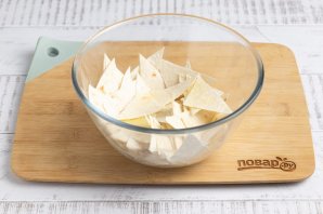 Переложите в глубокую миску и полейте растительным маслом. Хорошо перемешайте, чтобы весь лаваш был покрыт маслом.