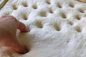 10. Через 45 минут снимите пленку, пальцами сделайте углубления по всему тесту.