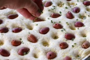 12. Выложите маслины в некоторые углубления и посыпьте крупной морской солью. Нарежьте мелко 1-2 веточки розмарина и посыпьте выпечку.