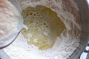 2. В чашу миксера просейте муку, добавьте к ней соль, 2 столовые ложки оливкового масла и влейте дрожжевую смесь.