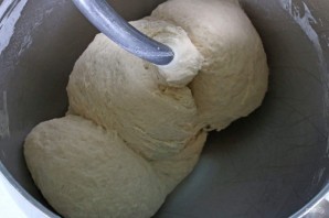 3. Установите крюк и замешивайте тесто на низкой скорости, когда все ингредиенты будут держаться воедино, увеличьте скорость и вымешивайте еще 5-7 минут.