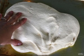 8. Выложите тесто на противень с оливковым маслом и руками разровняйте его по форме.