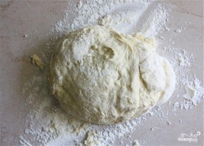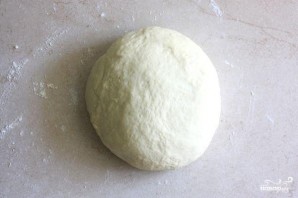 2. Выложить тесто на обильно посыпанную мукой поверхность и месить в течение 4-5 минут. Положить тесто в слегка смазанную маслом миску и перевернуть, чтобы все тесто покрылось маслом. Дать подняться при комнатной температуре, накрыв полиэтиленовой пленкой, пока тесто не увеличится в объеме вдвое, от 1 до 1 1/2 часа.