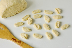 Адшчыпіце ад цеста кавалак, скатайце ў колбаску і нарэжце невялікімі кавалачкамі (памер залежыць ад пажаданага памеру галушак).