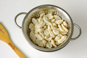 Зварыце галушкі ў пасоленай вадзе каля 10-15 хвілін да поўнай гатоўнасці. Потым зліце праз друшляк, каб стекла ўся лішняя вадкасць.