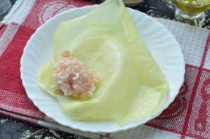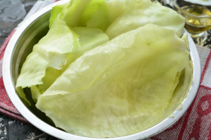 Зварыце капустныя лісціцкі працягам 2 хвілін, каб яны размякнулі, астудзіце і зрэжце патаўшчэнні ў аснове.