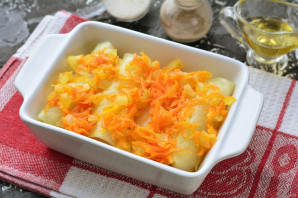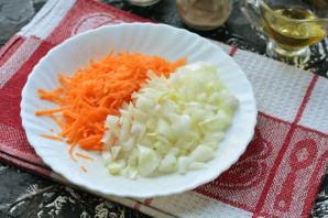 Цыбулю нарэжце кубікамі, а моркву патрыце на цёрцы. Падсмажце паслядоўнасць 2-3 хвіліны на патэльні з даданнем невялікай колькасці алею.