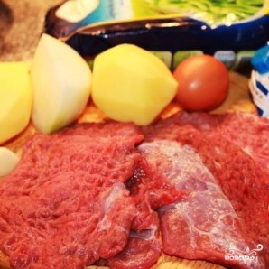 Говяжье филе нарезаем поперек волокон на тонкие куски (если у вас 300 граммов говядины - должно получиться 4 куска). Получившиеся куски хорошенько отбиваем с обеих сторон, солим и перчим. Овощи моем и чистим.