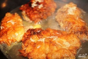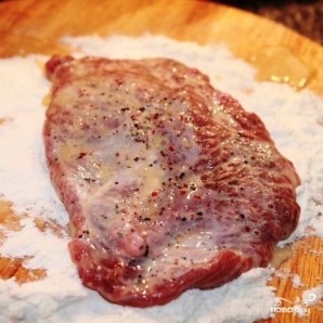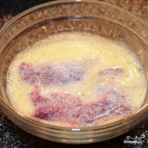 Затем обмакиваем отбивные во взбитые яйца, после чего повторяем процедуру - еще раз в муке и еще раз в яйце.