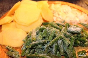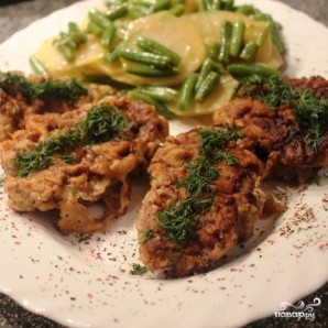 Собственно, отбивные готовы, и осталось лишь приготовить к ним гарнир. Гарнир я готовлю так: обжариваю в масле мелко нарезанный лук до прозрачности, потом добавляю картофель, жарю их вместе 10 минут, затем добавляю стручковую фасоль и тушу под крышкой на среднем огне около 10 минут.
