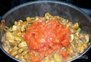 4. Дадайце да грыбоў пасмяляныя памідоры.