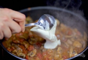 5. Тушыце грыбы на павольным агні. Дадайце кроп, папрыку, перац і смятану.
