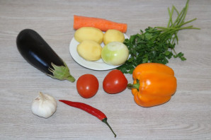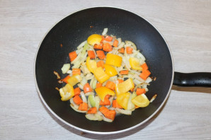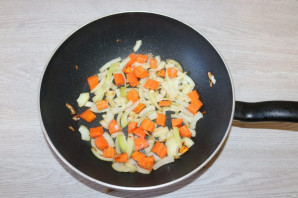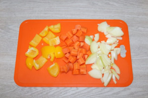 Лук нарэжце чвэрцямі кружкоў, моркву брусочкамі, перац вялікімі кубікамі.