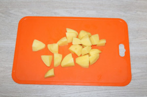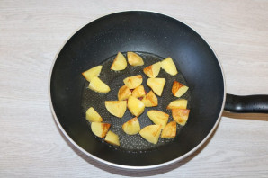 Хутка пасмаляйце пасудзіну на моцным агні паасобна. Бульбу пасмаляйце ў скавародзе, дадаўшы невялікую колькасць алею.