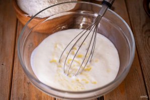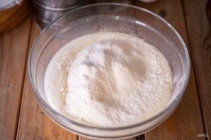 В просторную миску залейте кефир, добавьте соду, соль. Перемешайте.