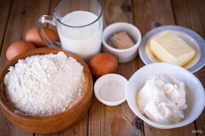 Все ингредиенты выложите на стол. Молоко подогрейте до температуры в 35 градусов.