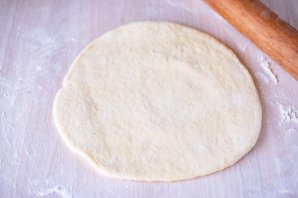 Рабочую поверхность припылите небольшим количеством муки и раскатайте скалкой одну часть теста в лепешку диаметром примерно в 20 см.
